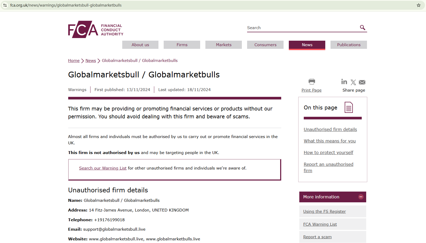 • 2024-11-17 هيئة السلوك المالي (FCA) تصدر تحذيرا ضد Globalmarketbulls