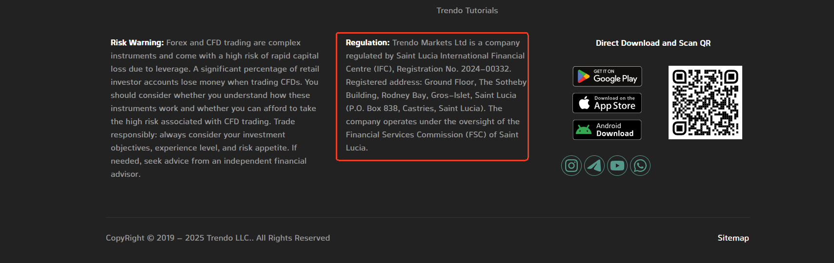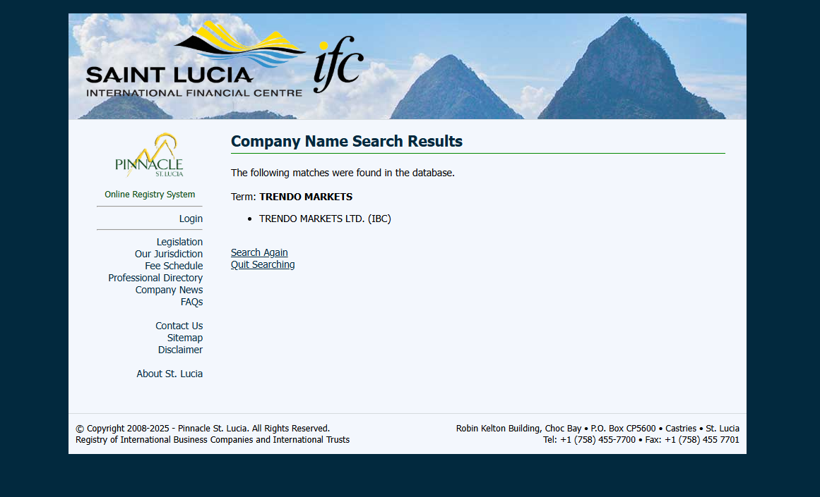 تدّعي شركة Trendo أنها تُدار من قِبل شركة Trendo Markets Ltd ، وهي شركة مسجلة في سانت لوسيا. ورغم تأكيدنا تسجيلها في قاعدة بيانات المركز المالي الدولي في سانت لوسيا (IFC)، من الضروري إدراك أن هذا التسجيل يمنح الشركة صفة شركة أعمال دولية (IBC) فقط، وهو ما لا يُعادل ترخيصًا ماليًا. والجدير بالذكر أن المركز المالي الدولي لا يُنظّم أو يُرخّص أنشطة تداول العملات الأجنبية (الفوركس)، ولا توجد في سانت لوسيا حاليًا أي هيئة تنظيمية مالية مُعترف بها تُشرف على أسواق العملات الأجنبية أو الأوراق المالية.