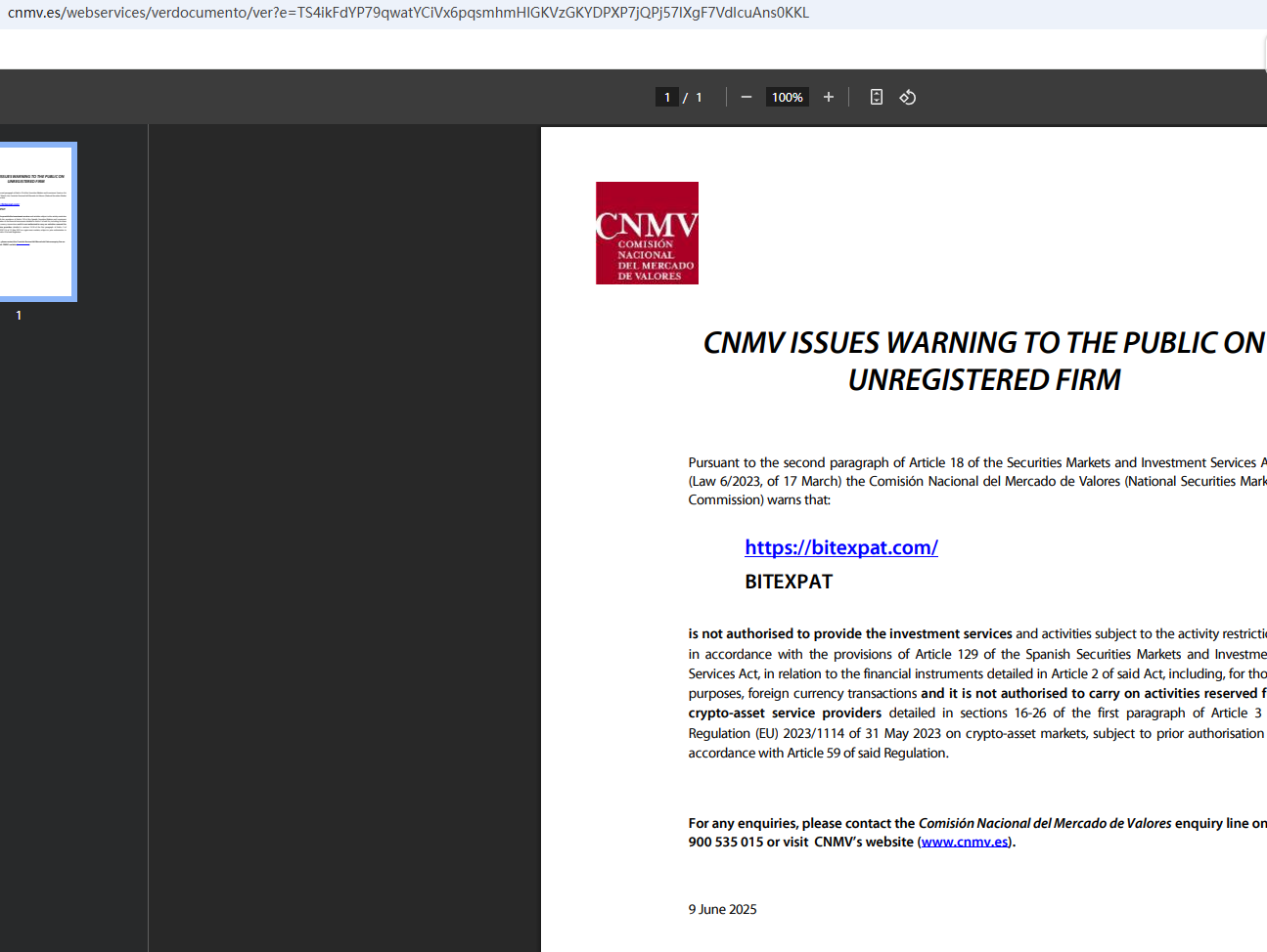 في 9 يونيو 2025 ، أصدرت اللجنة الوطنية لسوق الأوراق المالية (CNMV) تحذيرا ضد Bitexpat ، معتقدة أن هذه الشركة قد تقدم خدمات أو منتجات مالية دون إذن مناسب. https://www.cnmv.es/webservices/verdocumento/ver?e=ETcz7y5kevTZSix4R9t5%2bpqsmhmHlGKVzGKYDPXP7jQPj57IXgF7VdIcuAns0KKL