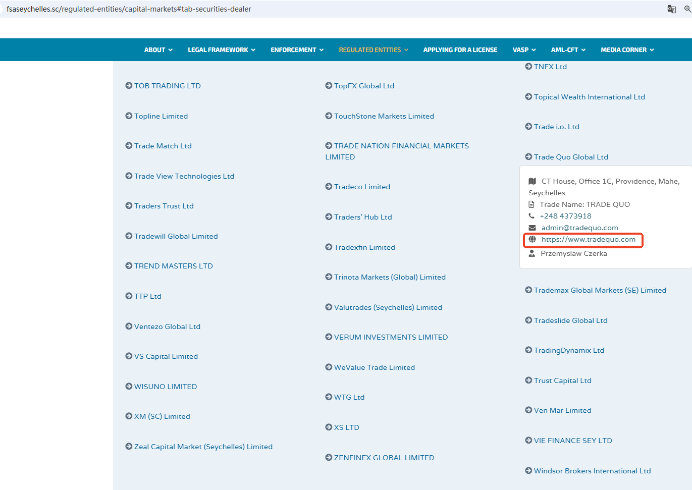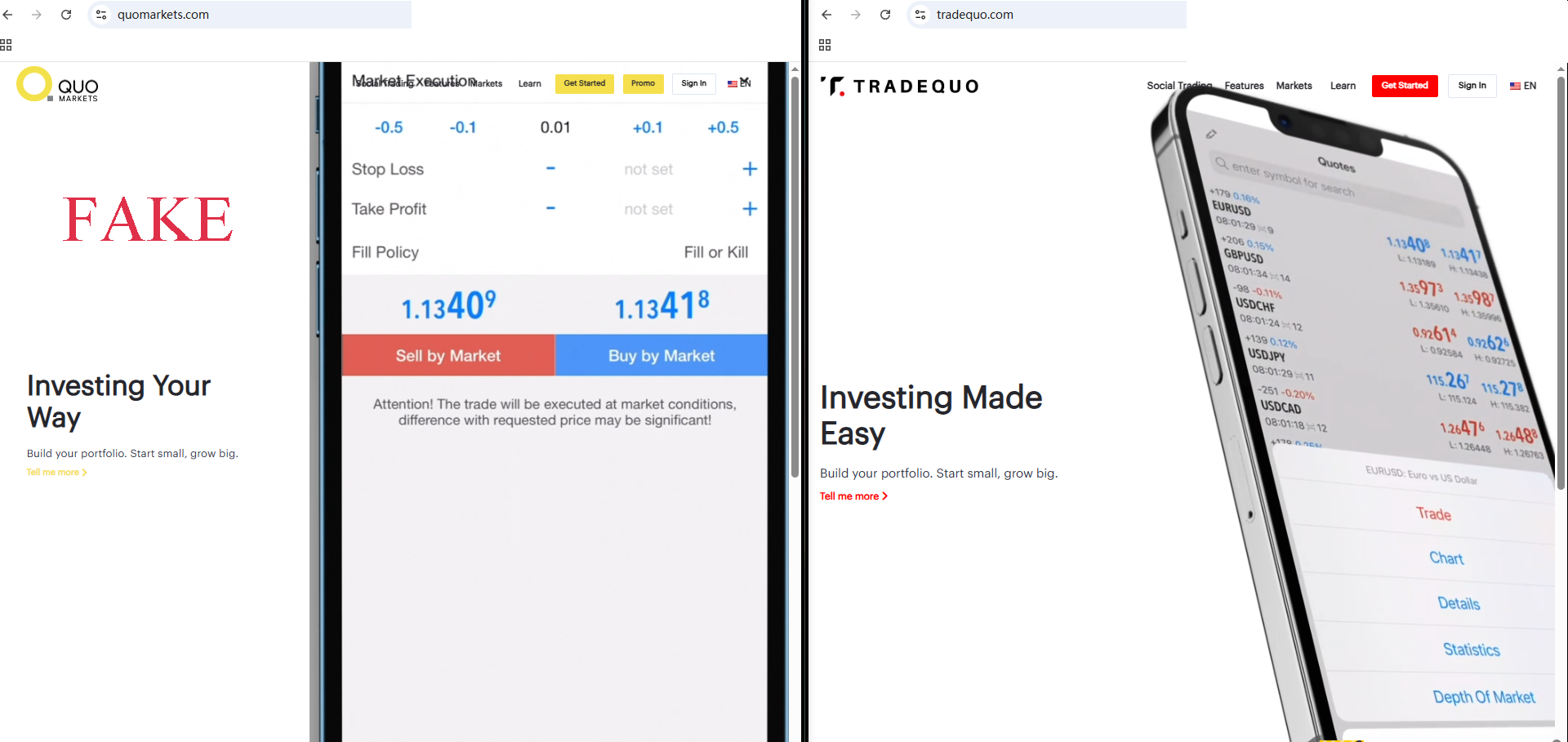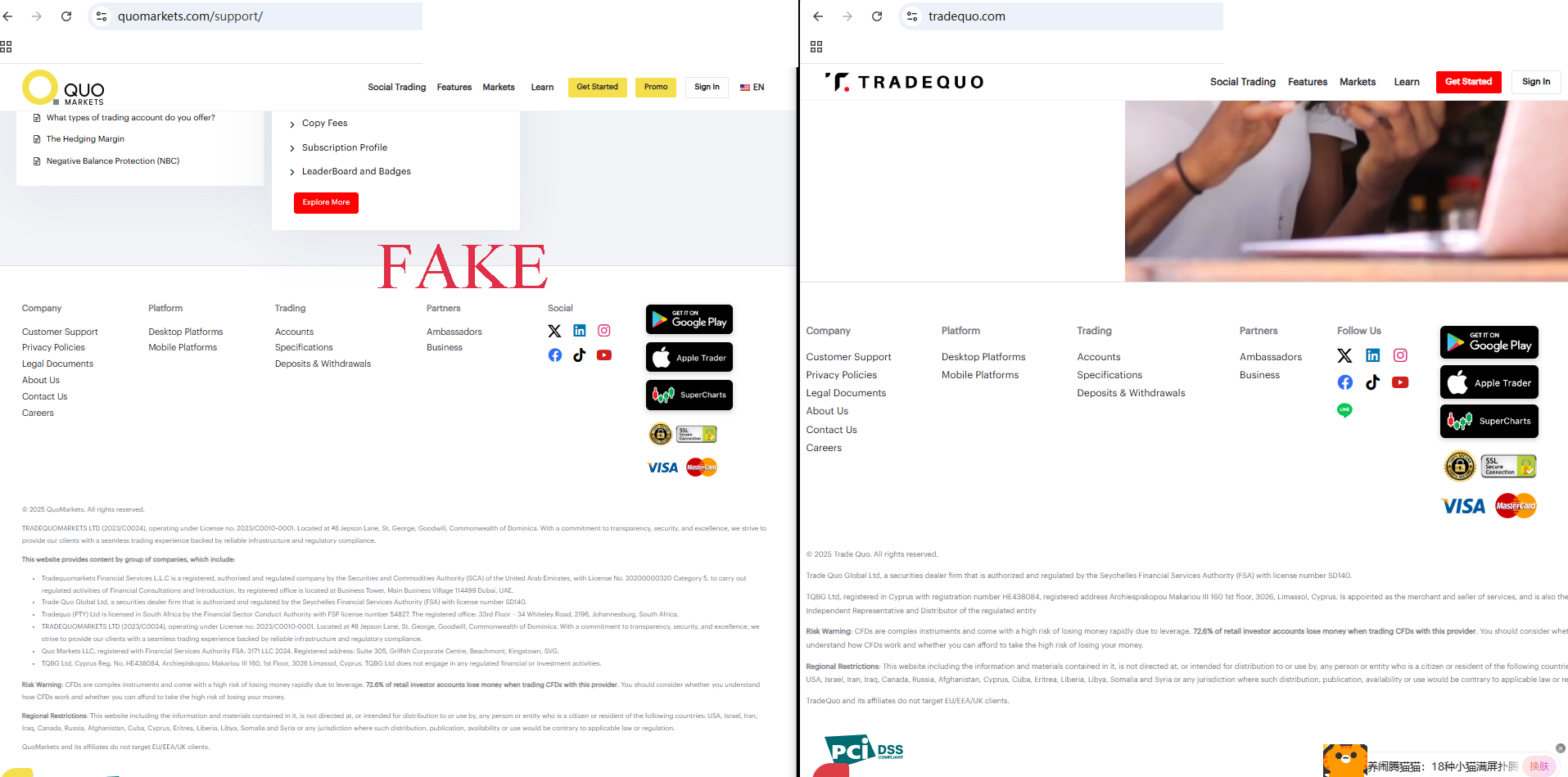 وفقًا لموقعها الإلكتروني، تزعم أنها مسجلة لدى جهات تنظيمية متعددة. تحققنا من الأمر مع هيئة الخدمات المالية في سيشل (Seychelles FSA) المختصة. وجدنا أن عنوان موقع quomarkets.com الإلكتروني لا يتطابق مع موقع الشركة المسجل لدى الهيئة، مما يعني بوضوح إساءة استخدام عنوان موقع شركة مُبلّغة. قادنا المزيد من التحقيق إلى الشركة المُشتكية نفسها. كشفت مقارنة دقيقة بين الموقعين الإلكترونيين أن quomarkets.com لم يكتفِ بنسخ المعلومات التنظيمية للشركة المُبلّغة، بل استخدم أيضًا نفس تصميم الموقع ولغة التسويق. والجدير بالذكر أن الهيئة الوطنية لسوق الأوراق المالية (CNMV) أصدرت تحذيرًا ضد quomarkets.com، معتقدةً أن هذه الشركة قد تُقدّم خدمات أو منتجات مالية دون ترخيص مناسب.