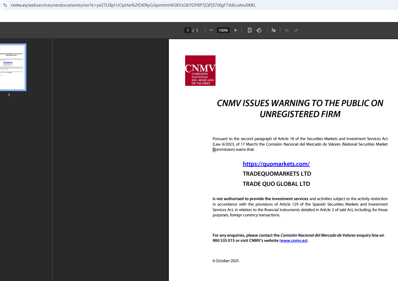 في 6 أكتوبر 2025، أصدرت هيئة سوق الأوراق المالية الوطنية (CNMV) تحذيرًا ضد quomarkets.com، معتقدةً أن هذه الشركة قد تقدم خدمات أو منتجات مالية دون الحصول على الترخيص المناسب. https://www.cnmv.es/webservices/verdocumento/ver?e=ye27L0lpl1rOpHw%2fDKNyGJqsmhmHlGKVzGKYDPXP7jQPj57IXgF7VdIcuAns0KKL