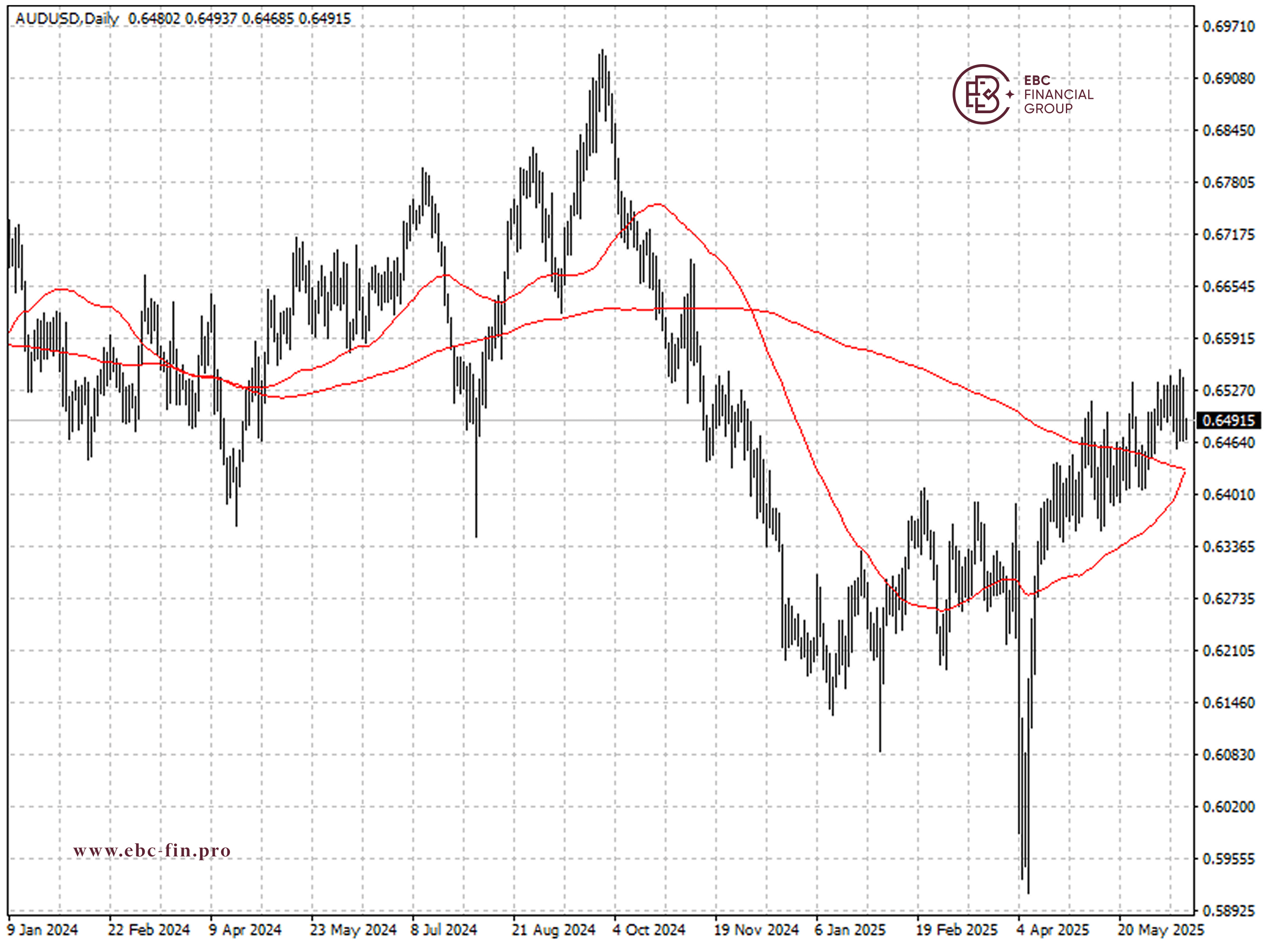 The Aussie dollar is about to show the golden cross. If that happens, we expect another leg higher which could lead to 0.6600, last seen in November 2024.