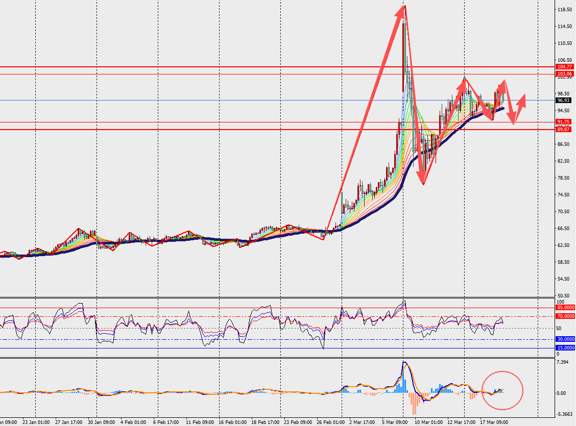 技术面: 欧元兑美元H4级别小幅反弹,并在48日多空分界线附近运行。另一方面,MACD双线与量能柱在零轴附近收敛。若油价飙升冲击持续性得到确认,市场定价的年内加息预期可能进一步强化,欧元或获支撑,风险资产承压。