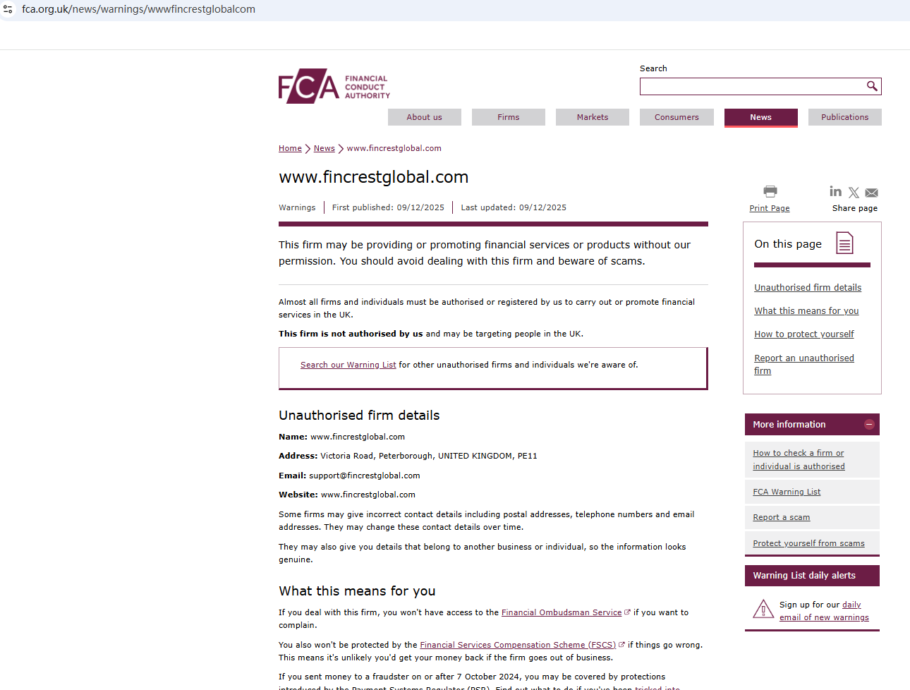 في 9 ديسمبر 2025، أصدرت هيئة السلوك المالي (FCA) تحذيراً بشأن شركة Fincrestglobal، مشتبهة في أن هذه الشركة قد تقدم خدمات أو منتجات مالية بدون الترخيص اللازم. without the necessary authorization. https://www.fca.org.uk/news/warnings/wwwfincrestglobalcom