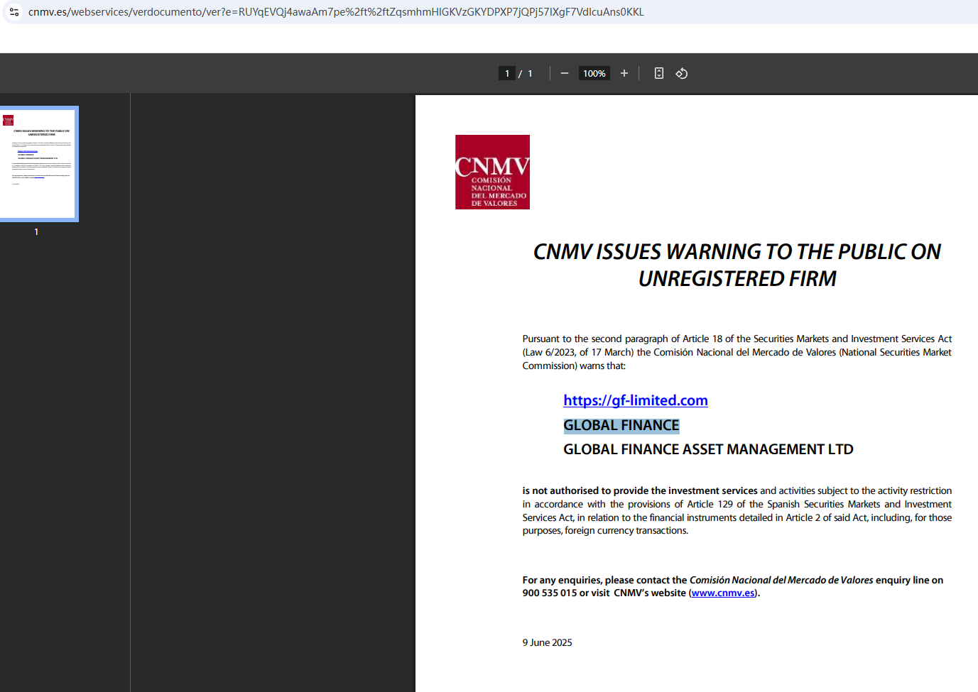 في 9 يونيو 2025 ، أصدرت اللجنة الوطنية لسوق الأوراق المالية (CNMV) تحذيرا ضد جلوبال فاينانس ، معتقدة أن هذه الشركة قد تقدم خدمات أو منتجات مالية دون إذن مناسب. https://www.cnmv.es/webservices/verdocumento/ver?e=RUYqEVQj4awaAm7pe%2ft%2ftZqsmhmHlGKVzGKYDPXP7jQPj57IXgF7VdIcuAns0KKL