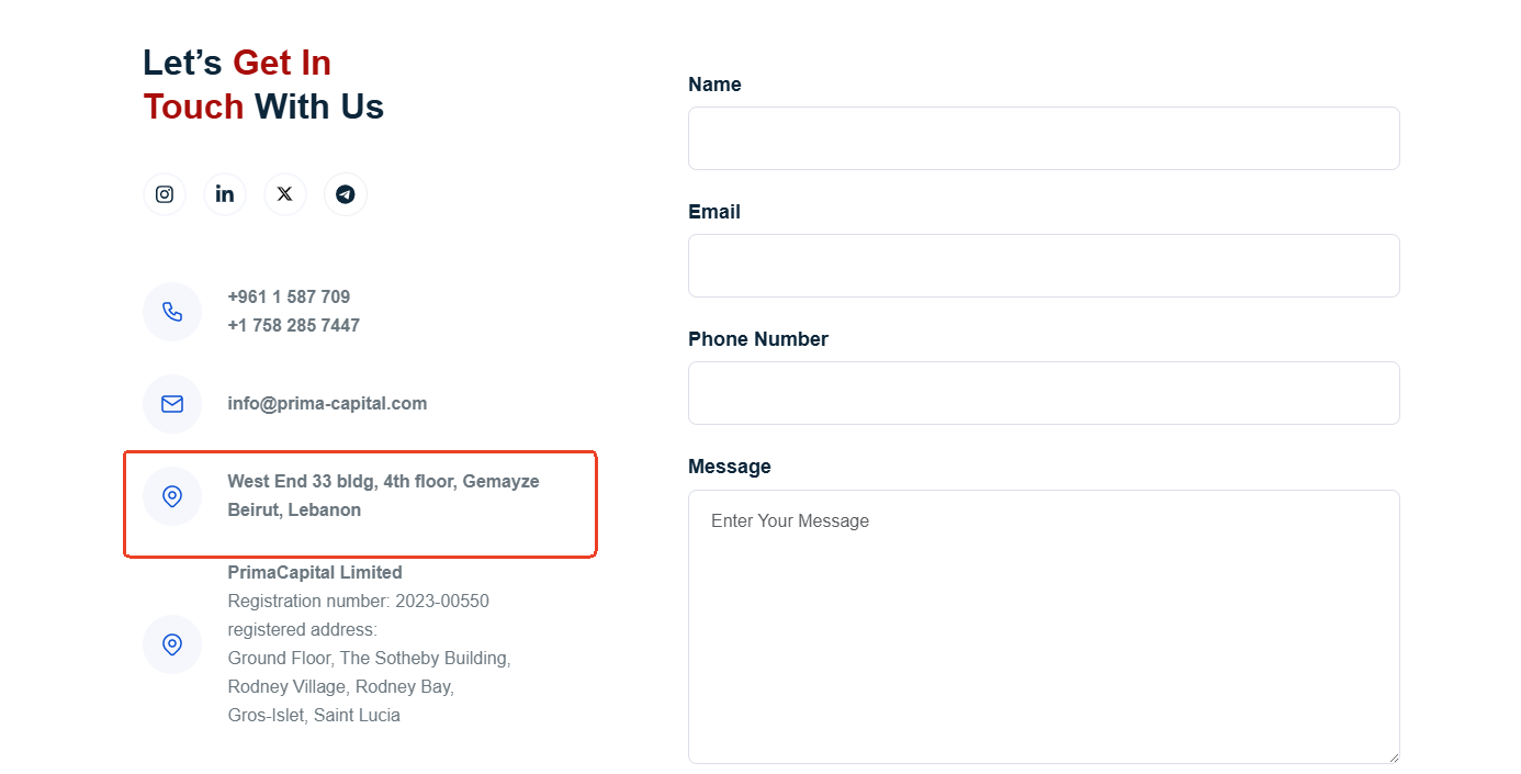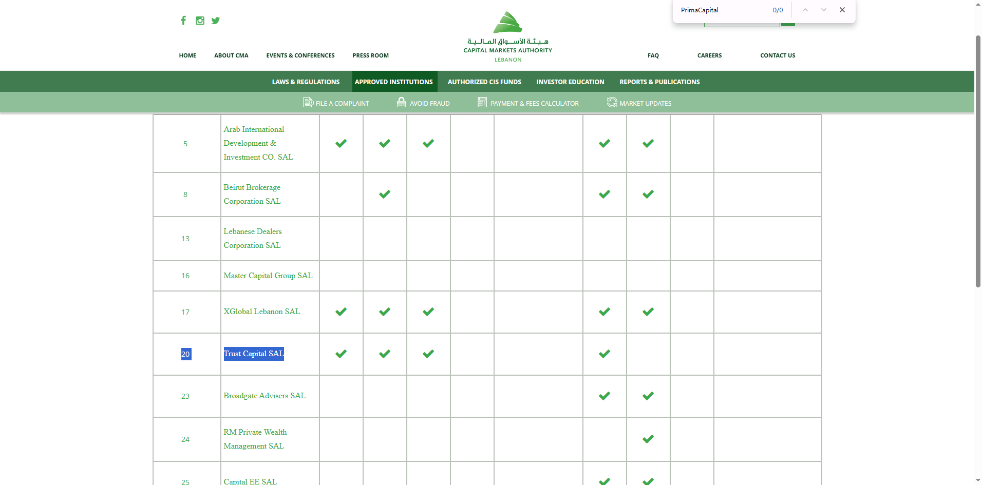 Additionally, Prima Capital claims to maintain a physical presence in Lebanon. However, our search of the Lebanese Capital Markets Authority (CMA) yielded no licensed entity associated with Prima Capital or its stated legal name.