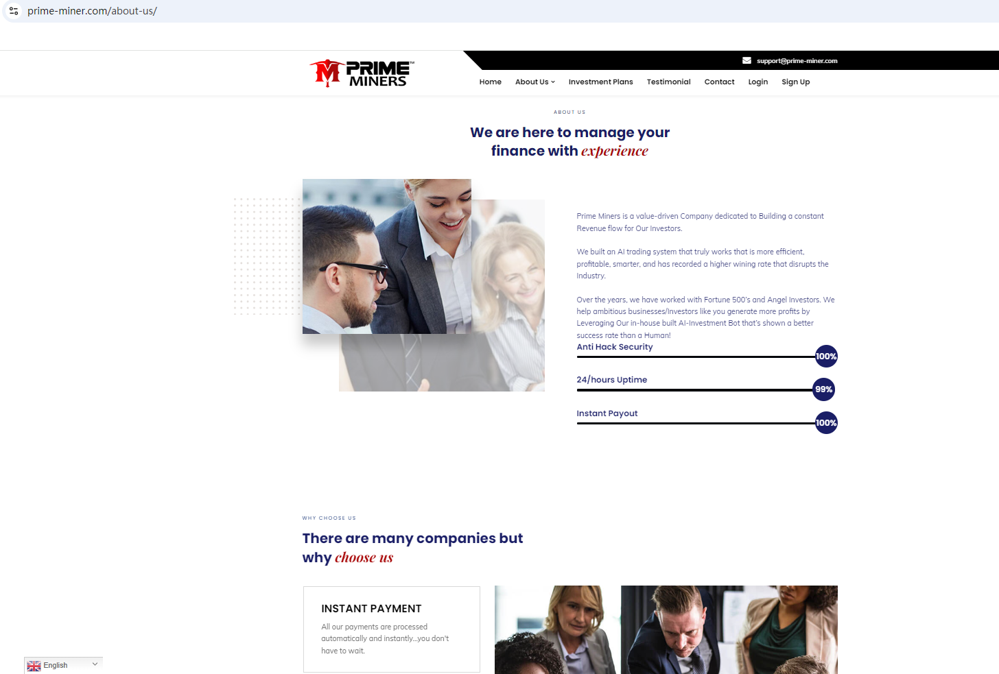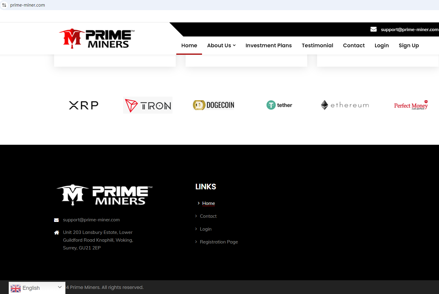 برايم ماينرز هو موقع واضح أنه احتيالي، وغالباً ما يتم تجميع مثل هذه المواقع بشكل متعجل وتظهر سمات شائعة معينة. فهي تستبدل ببساطة أسماء العلامات التجارية الموجودة في المحتوى بأسمائها الخاصة، وغالباً ما تهمل التأكد من الدقة النحوية أو التناسق المنطقي. برايم ماينرز هو مثال رئيسي على هذا النوع من الاحتيال. يستخدم نفس نموذج الموقع الإلكتروني مثل احتيال تكنولوجيا blockchain العالمية الذي تم الكشف عنه سابقًا بواسطة بروكرز فيو. وما هو أكثر من ذلك، يقع في المملكة المتحدة. ومع ذلك، أصدرت هيئة السلوك المالي (FCA) تحذيرًا ضد برايم ماينرز بسبب عملها بدون الترخيص المطلوب. في الجوهر، لا يتم تنظيم برايم ماينرز من قبل أي هيئة حكومية. من المخاطر العالية إسناد أموال المستثمرين لها، لأنه لا توجد حماية قانونية لحماية الأموال. يبدو أن برايم ماينرز هو احتيال.