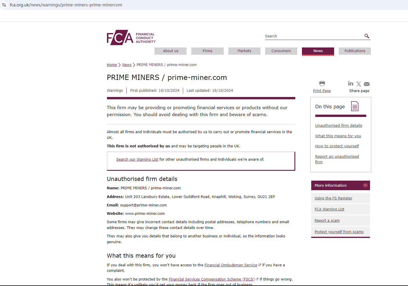 وما هو أكثر من ذلك، يقع في المملكة المتحدة. ومع ذلك، أصدرت هيئة السلوك المالي (FCA) تحذيرًا ضد برايم ماينرز بسبب عملها بدون الترخيص المطلوب.