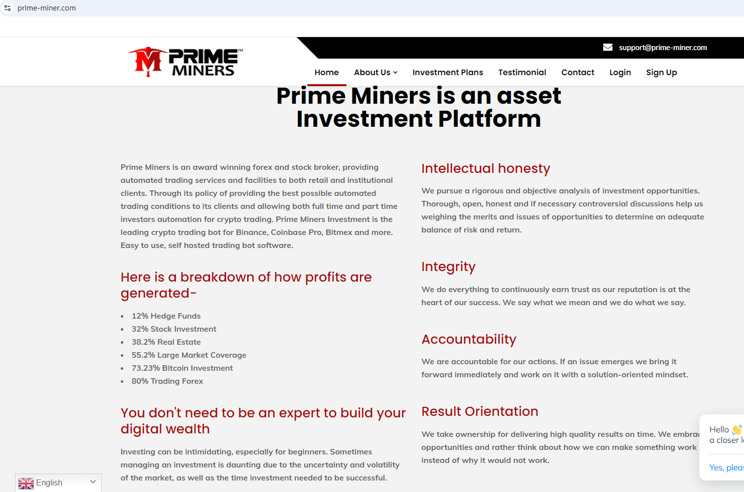 برايم ماينرز هو موقع واضح أنه احتيالي، وغالباً ما يتم تجميع مثل هذه المواقع بشكل متعجل وتظهر سمات شائعة معينة. فهي تستبدل ببساطة أسماء العلامات التجارية الموجودة في المحتوى بأسمائها الخاصة، وغالباً ما تهمل التأكد من الدقة النحوية أو التناسق المنطقي. برايم ماينرز هو مثال رئيسي على هذا النوع من الاحتيال. يستخدم نفس نموذج الموقع الإلكتروني مثل احتيال تكنولوجيا blockchain العالمية الذي تم الكشف عنه سابقًا بواسطة بروكرز فيو.