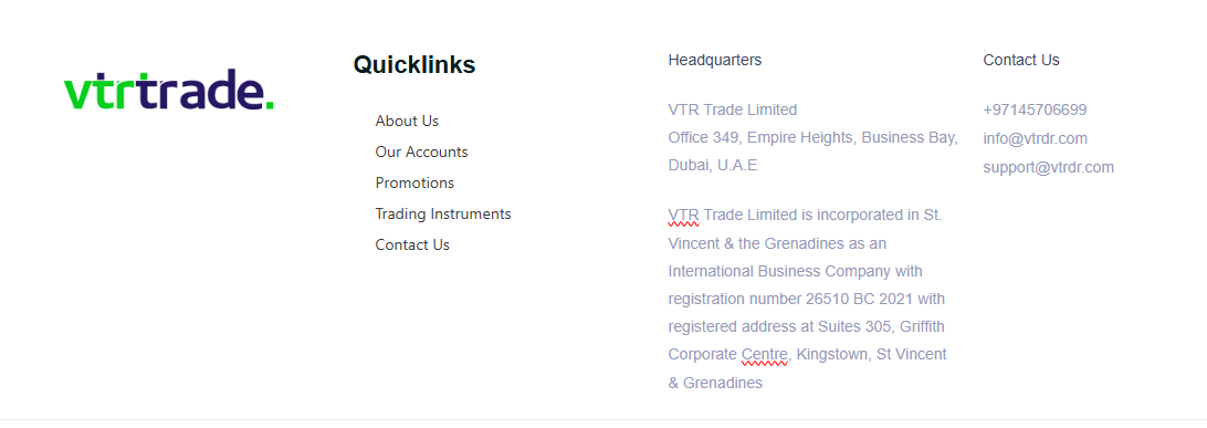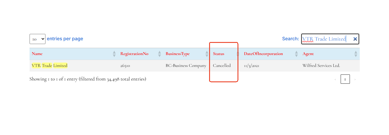 تدّعي شركة VTR Trade أنها شركة مسجلة في سانت فنسنت وجزر غرينادين، ولها مكتب في الإمارات العربية المتحدة. أولًا، بحثنا في سجل هيئة الخدمات المالية (FSA) في سانت فنسنت وجزر غرينادين عن شركة VTR Trade Limited، ووجدنا أن حالة تسجيلها مُدرجة على أنها "ملغاة". هذا يشير إلى أن الشركة لم تعد تتمتع بسمعة طيبة، وقد لا تكون مُصرّحًا لها قانونيًا بالعمل، مما يُثير شكوكًا فورية حول وضعها التجاري الحالي.ثانيًا، راجعنا قواعد بيانات الجهات التنظيمية المالية الرئيسية في دولة الإمارات العربية المتحدة - هيئة الأوراق المالية والسلع (SCA) ومصرف الإمارات العربية المتحدة المركزي (CBUAE) - ولم نجد أي سجل لشركة VTR Trade أو أي كيان تابع لها. وهذا يؤكد أن المنصة لا تملك ترخيصًا ساريًا للعمل كوسيط في دولة الإمارات العربية المتحدة.لذلك، يبدو أن VTR Trade عبارة عن عملية احتيال.