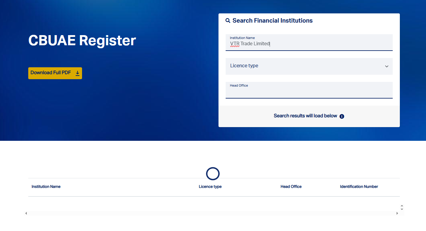 ثانيًا، راجعنا قواعد بيانات الجهات التنظيمية المالية الرئيسية في دولة الإمارات العربية المتحدة - هيئة الأوراق المالية والسلع (SCA) ومصرف الإمارات العربية المتحدة المركزي (CBUAE) - ولم نجد أي سجل لشركة VTR Trade أو أي كيان تابع لها. وهذا يؤكد أن المنصة لا تملك ترخيصًا ساريًا للعمل كوسيط في دولة الإمارات العربية المتحدة.
