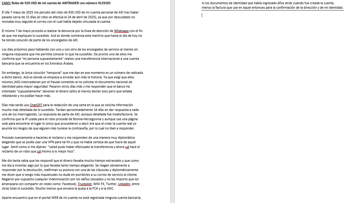 On May 7, 2025, I found USD 920 withdrawn from my AXI MT4 account on April 24, 2025, without my approval, to a UAE bank, leaving USD 7.51. AXI’s agent confirmed the fraud via WhatsApp but only gave a reference number, directing me to contact the bank. My KYC documents (ID, proof of address, bank details) were deleted from their portal, with no record of the fraudulent account. AXI noted the transaction came from a Bosnia-Herzegovina IP, a place I’ve never been (I’m in Colombia). They blamed me, citing a VPN or shared credentials, ignoring their duty to verify withdrawals. After 16 days, they referenced terms, refusing responsibility. I’ve reported this to ASIC, FCA, and The Financial Commission. AXI’s security lapses and poor response caused me significant loss.