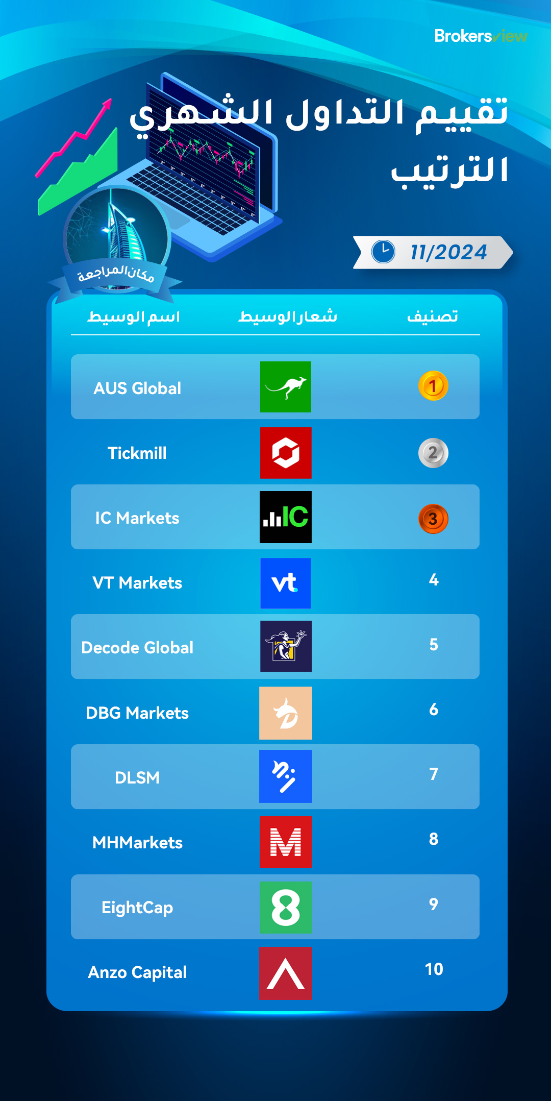 في شهر نوفمبر، أجرت BrokersView تقييمًا متعمقًا لأداء الوسطاء عبر فئات التداول الرئيسية. وتسلط النتائج الضوء على AUS Global باعتبارها الأفضل أداءً، تليها Tickmill وIC Markets. وحافظت كل من AUS Global وIC Markets على تصنيفاتهما القوية في نوفمبر، مما أظهر تميزًا ثابتًا.