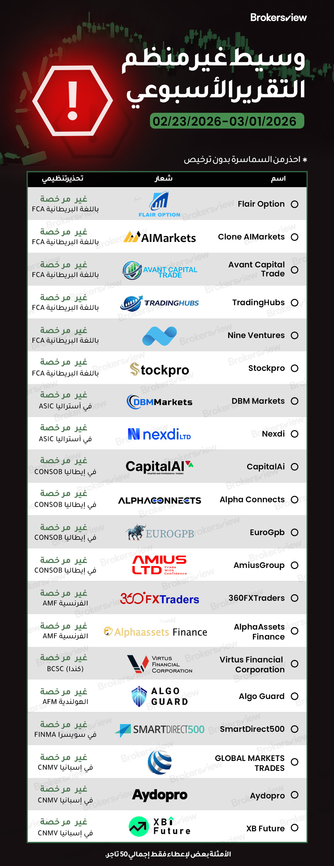 كشف تقرير استقصائي جديد صادر عن BrokersView عن وجود 50 وسيطًا غير مرخص خلال الأسبوع الممتد من 23 فبراير إلى 1 مارس 2026، متورطين في مخططات تداول مضللة عبر الإنترنت.