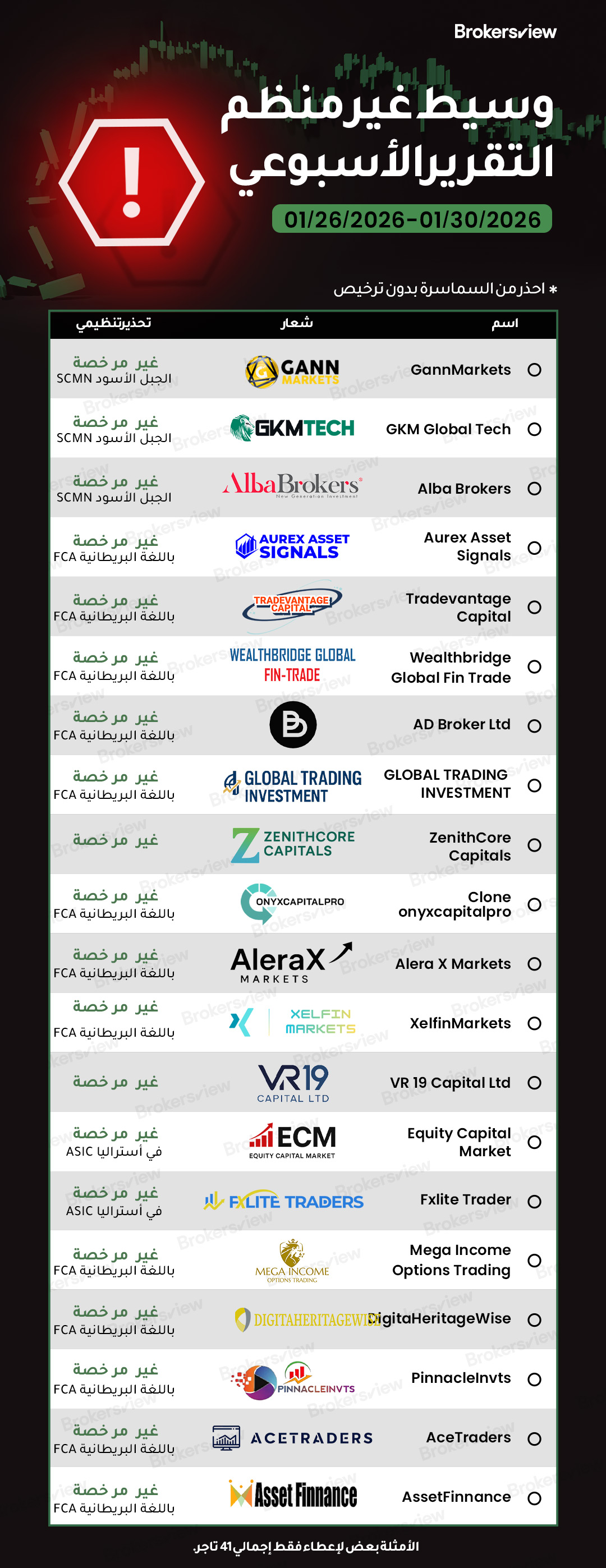 وسطاء الاحتيال الذين كشفت عنهم BrokersView في الفترة من 26 يناير 2026 إلى 30 يناير 2026 :