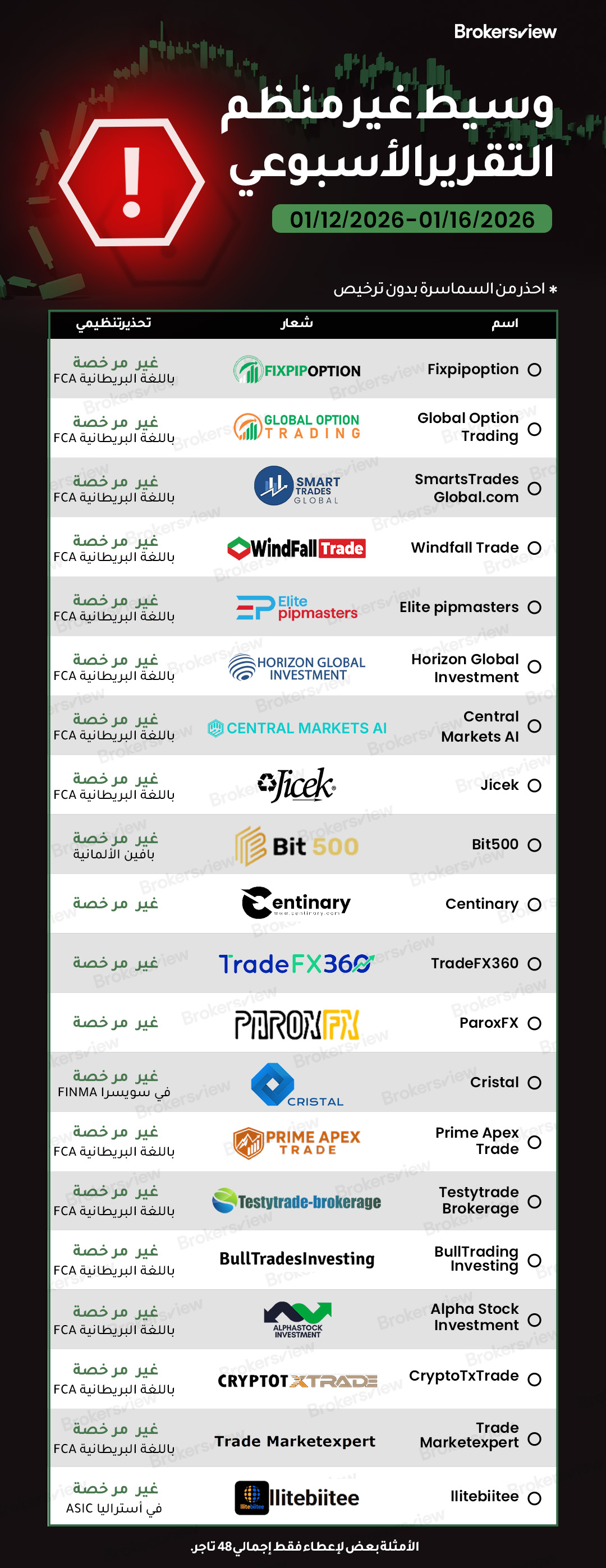 وسطاء الاحتيال الذين كشفت عنهم BrokersView في الفترة من 12 يناير 2026 إلى 16 يناير 2026 :