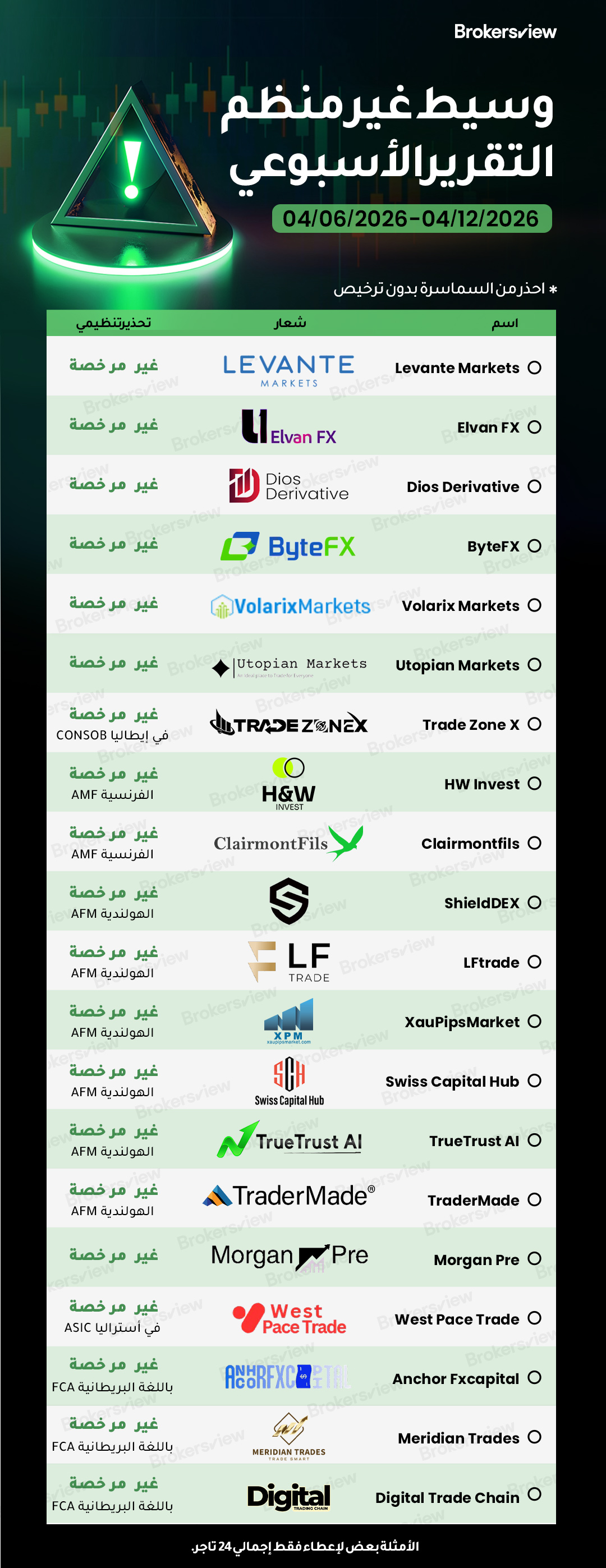 الوسطاء غير المرخصين الذين أبلغت عنهم BrokersView في الفترة ما بين 6 و12 أبريل 2026 :