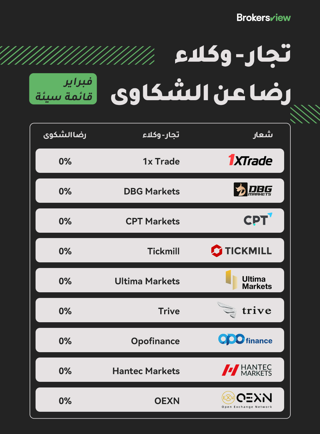 في شهر فبراير، غطت الشكاوى التي تلقتها شركة BrokersView مجموعة واسعة من القضايا، بما في ذلك رفض عمليات السحب، وإزالة الأرباح لأسباب غير مبررة، وعدم الرد على طلبات الشكاوى، والودائع المفقودة، والأنشطة الاحتيالية.