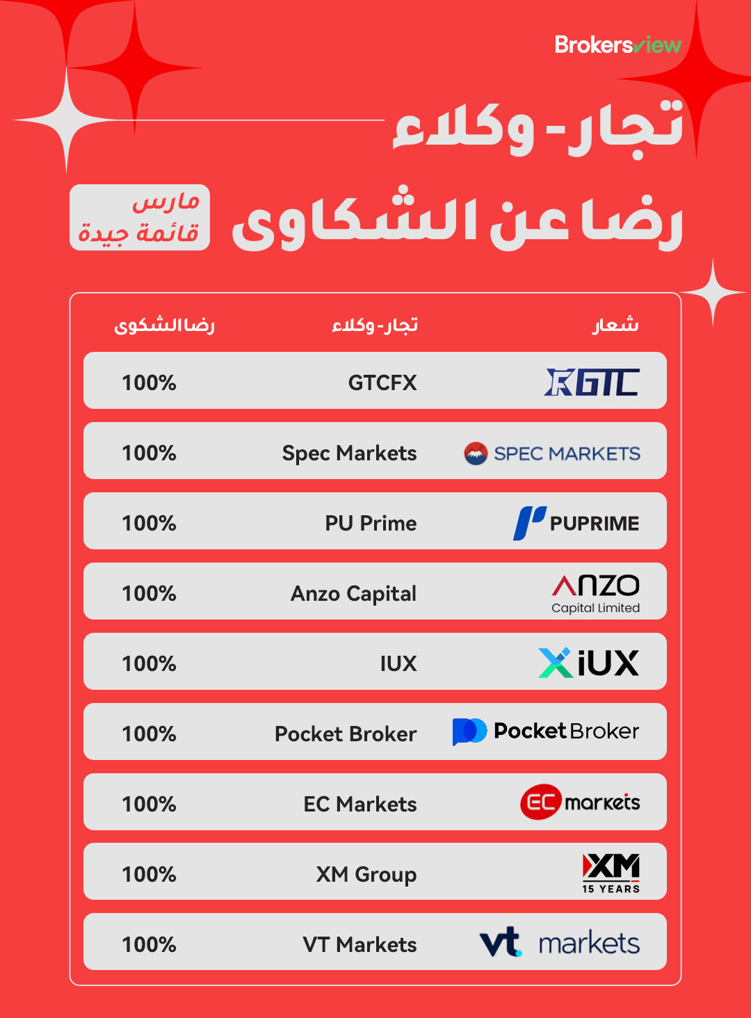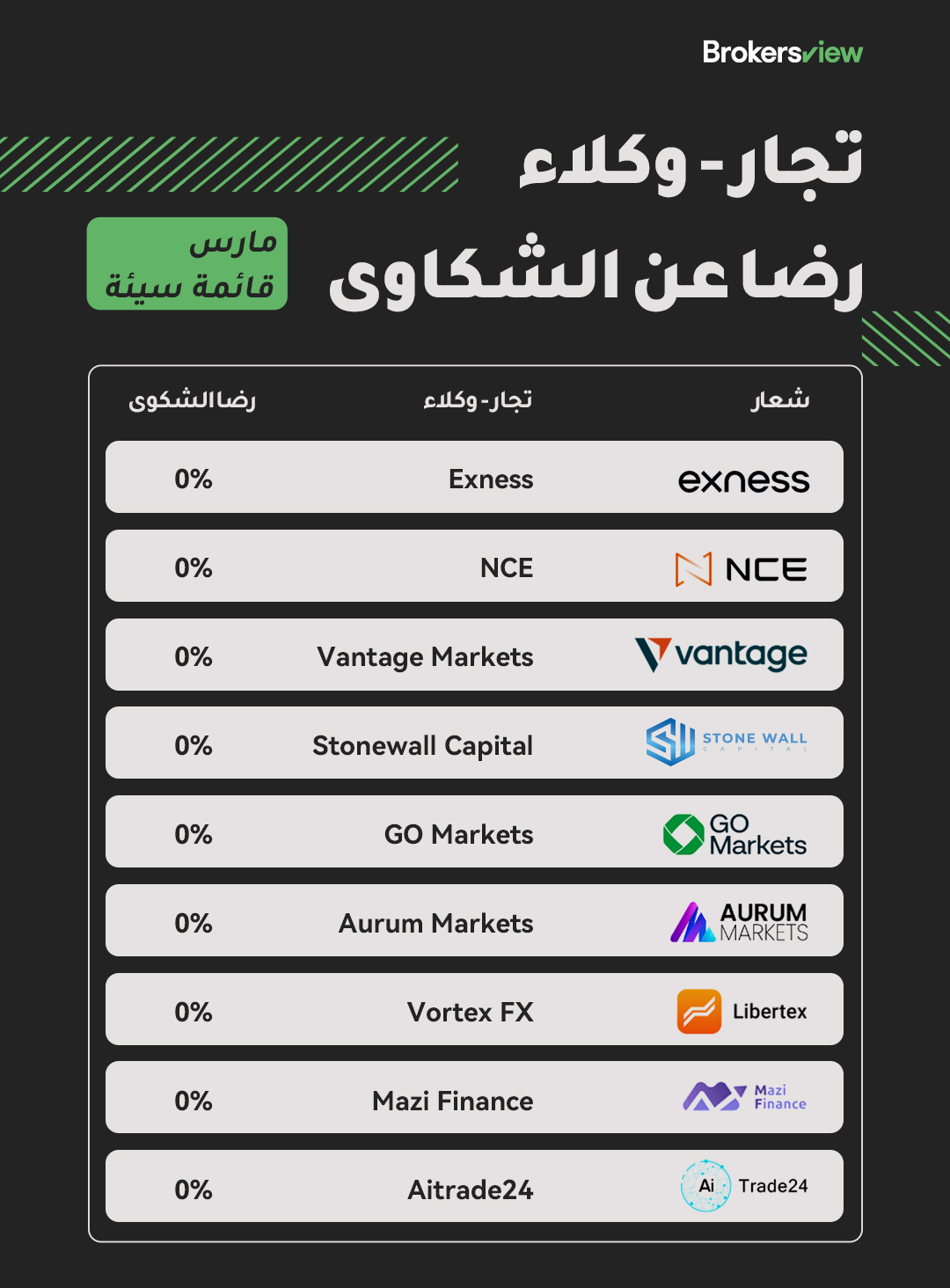 من جهة أخرى، سجل تسعة وسطاء معدل حل بنسبة 0%، مما يعني عدم حل أي شكاوى في شهر مارس: