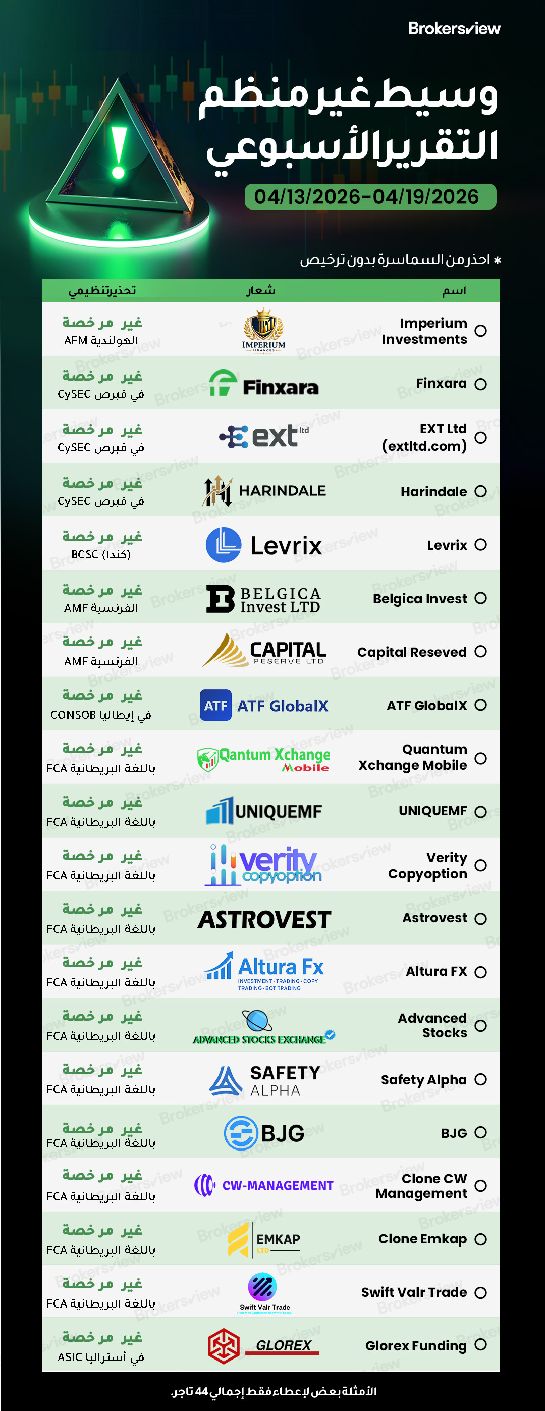 الوسطاء غير المرخصين الذين أبلغت عنهم BrokersView في الفترة ما بين 13 و19 أبريل 2026 :