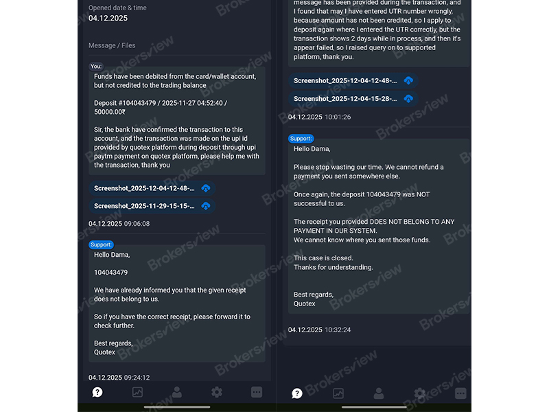 عندما قدّم المستخدم إثبات دفع قاطعًا إلى دعم العملاء، لم يتلقَّ حلاً. أصرّ دعم Quotex على أن "الإيصال ليس ملكًا لنا" وطالب بـ "الإيصال الصحيح". وبينما حاول المستخدم شرح احتمالية وجود خطأ في إدخال UTR خلال المحاولة الأولى، وحاول إعادة إرسال المعلومات الصحيحة، أصدر الدعم الحكم النهائي: "لم نتمكن من العثور على هذه الدفعة في نظامنا ولا يمكننا استرداد المبلغ". بعد ذلك، أُغلقت التذكرة فورًا.