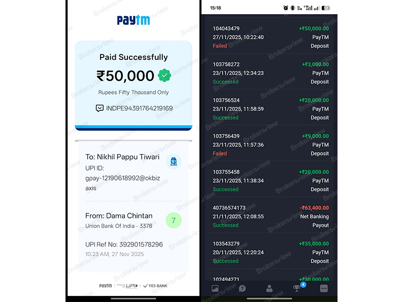 صرح المستخدم الهندي "User_MNIa" أنه في الساعة 10:23 صباحًا، قام بتحويل 50000 روبية هندية عبر Paytm إلى معرف UPI المقدم من Quotex (gpay-12190618992@okbiz axis).