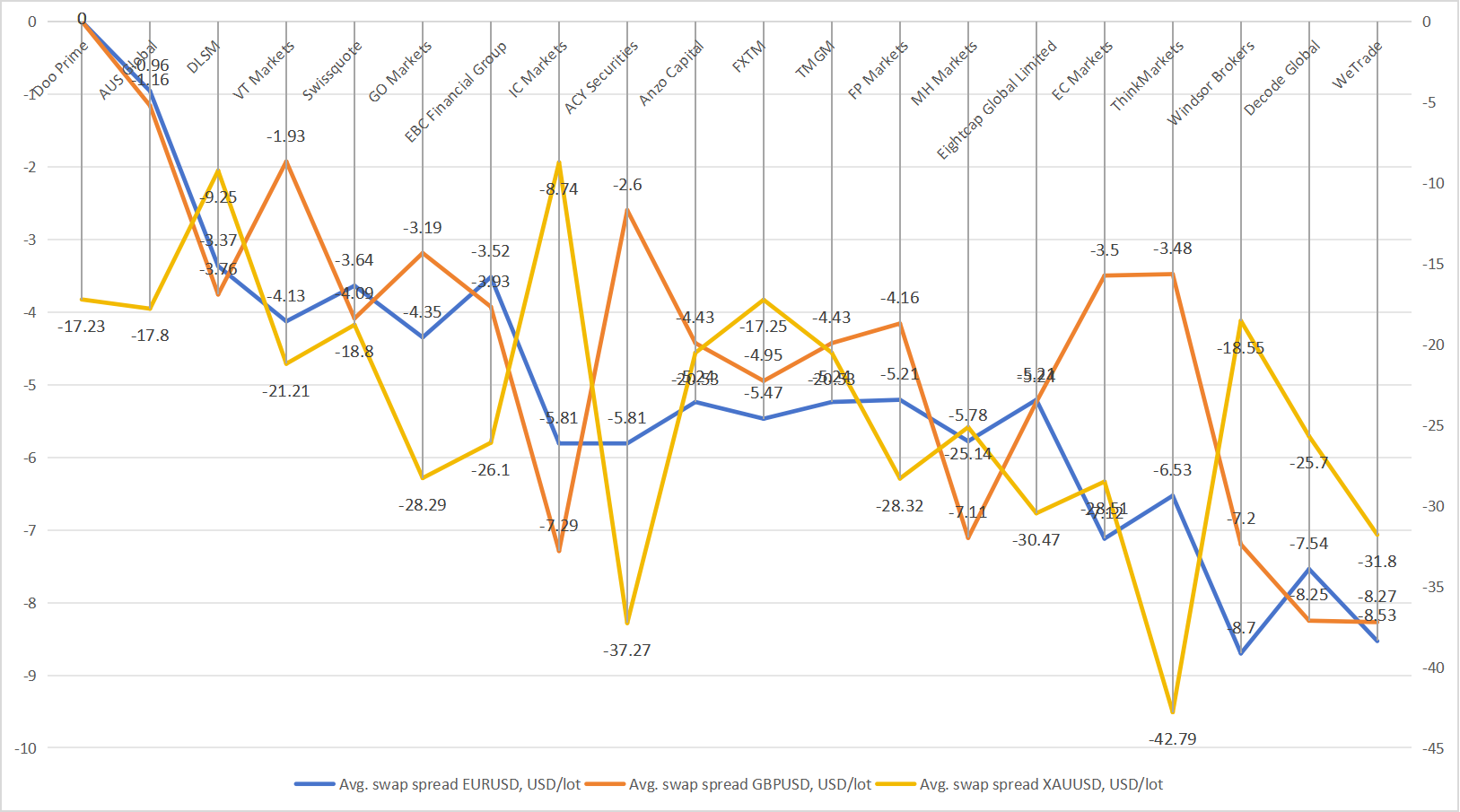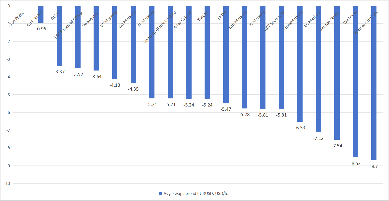 تتميز شركة Doo Prime بكونها الوسيط الوحيد الذي يقدم خدمة التداول بدون رسوم تبييت، مما يجعلها خيارًا جذابًا للغاية للمتداولين على المدى الطويل لEURUSD:. في المقابل، تبقى شركتا Windsor وWeTrade الخيارين الأقل تفضيلًا نظرًا لتكاليف التداول المرتفعة.