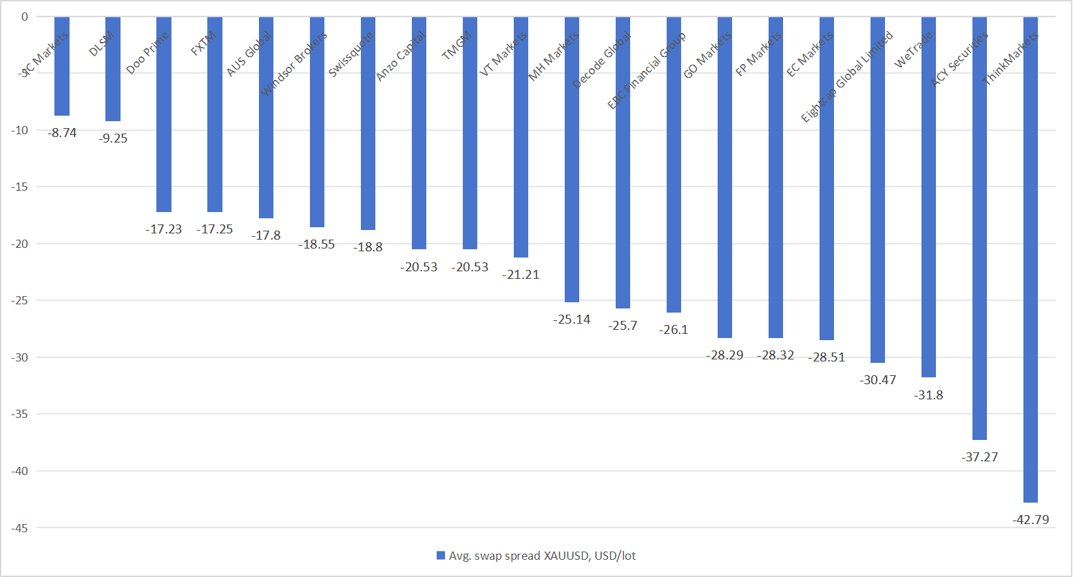 تُعدّ مقايضات الذهب قاسية بشكل عام. تفرض شركة ThinkMarkets أعلى تكلفة لليلة واحدة، تصل إلى حوالي -43 دولارًا أمريكيًا لكل عقد، مما يجعلها وسيطًا غير مناسب لمراكز الذهب مقابل الدولار الأمريكي (XAUUSD) الليلية. في المقابل، تُقدّم شركتا IC Markets وDLSM رسوم مقايضة أقل نسبيًا، مما يجعلهما خيارين أكثر أمانًا لاستراتيجيات تمويل الذهب.