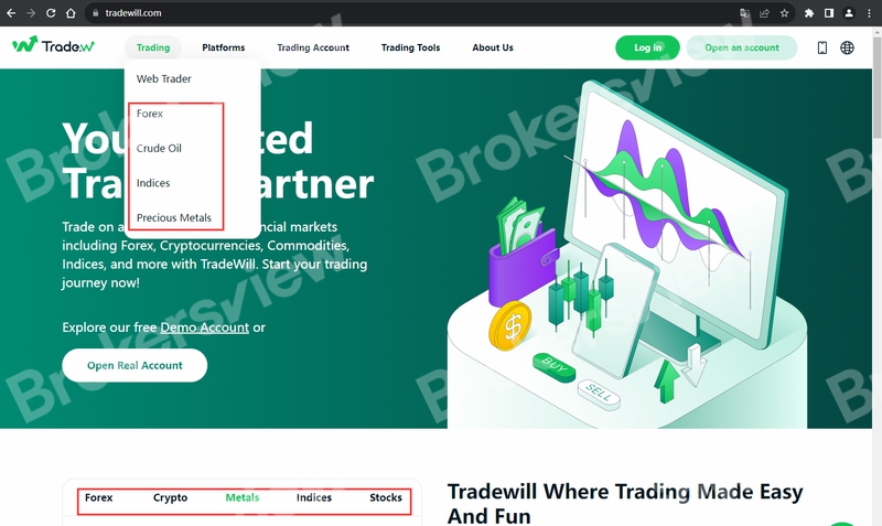 وفقًا للموقع الرسمي لشركة Tradewill، يقدم الوسيط خدمات التداول للمنتجات المالية بما في ذلك الفوركس والنفط الخام والمعادن الثمينة والأسهم والمؤشرات.