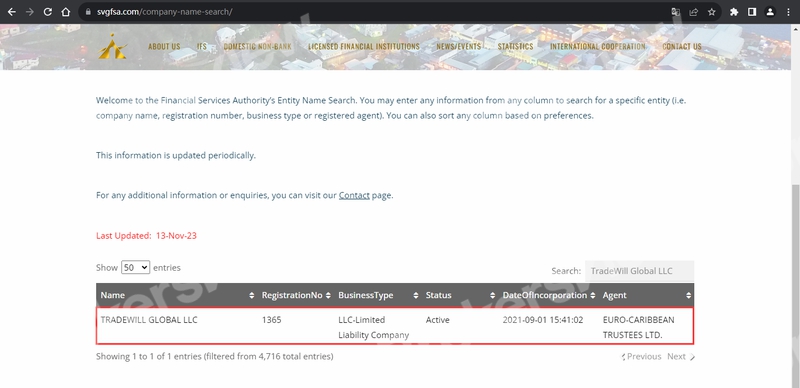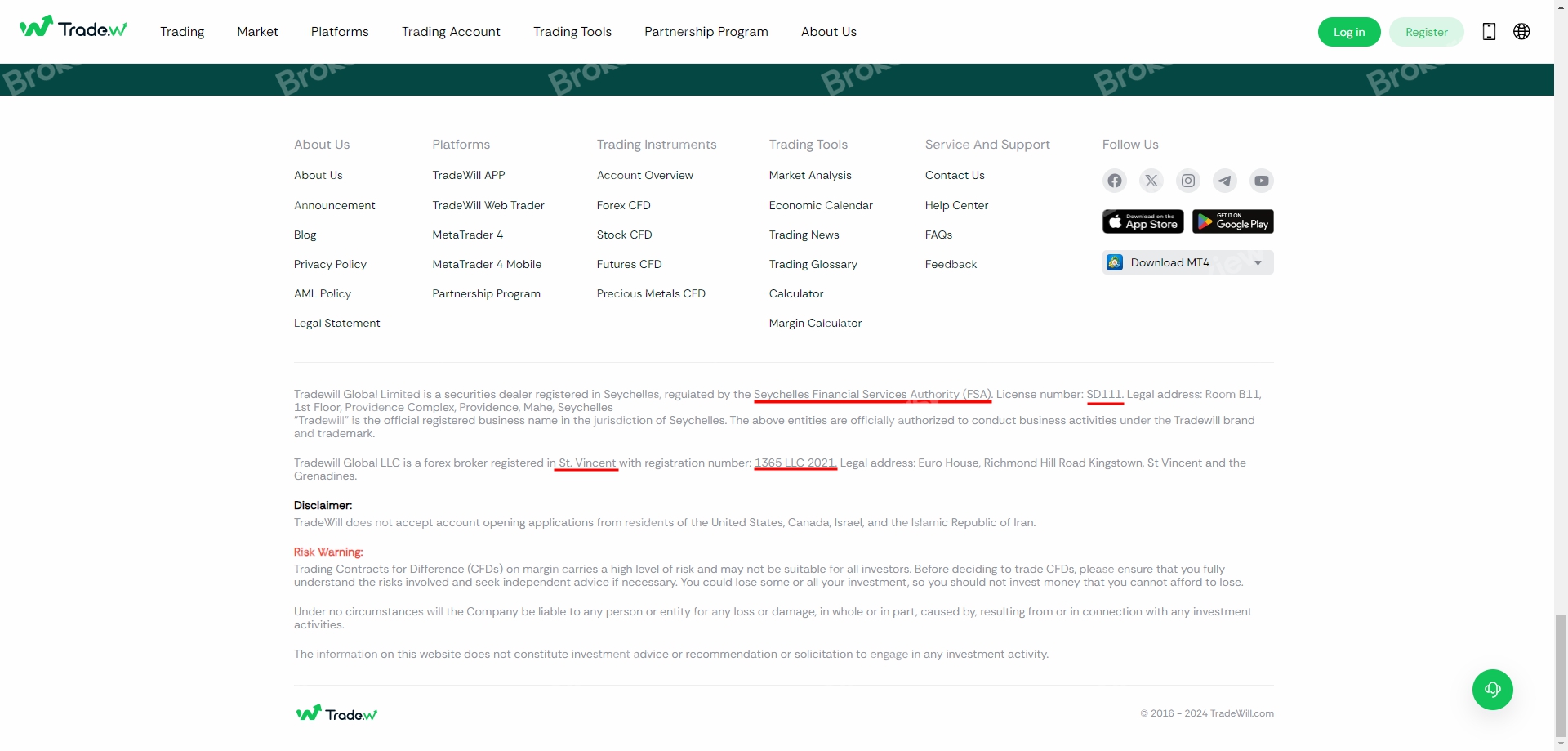 في حين يمكن العثور على معلومات حول Tradewill على موقع هيئة الخدمات المالية في سانت فينسنت وجزر غرينادين (SVGFSA)، فإن SVGFSA لا تنظم أو تراقب أو ترخص أو ترخص الشركات التجارية (BCs) المشاركة في أنشطة تداول العملات الأجنبية أو الوساطة.