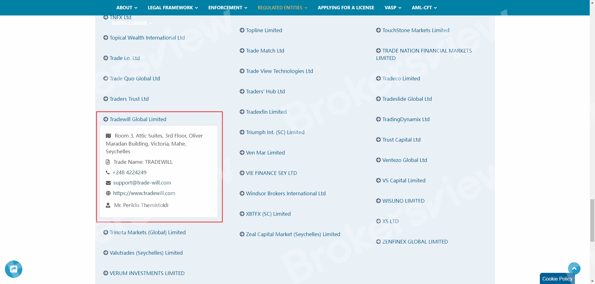 شركة Tradewill Global Limited، وهي شركة تداول أوراق مالية مسجلة في سيشل، تخضع للتنظيم من قبل هيئة الخدمات المالية في سيشل (FSA) برقم الترخيص SD111.