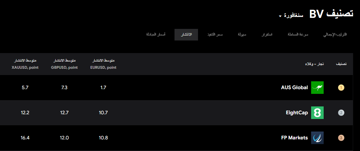 رقم 1: AUS Global، متوسط فروق الأسعار لزوج العملات EURUSD وGBPUSD وXAUUSD هي 1.7 و7.3 و5.7 نقطة على التوالي؛