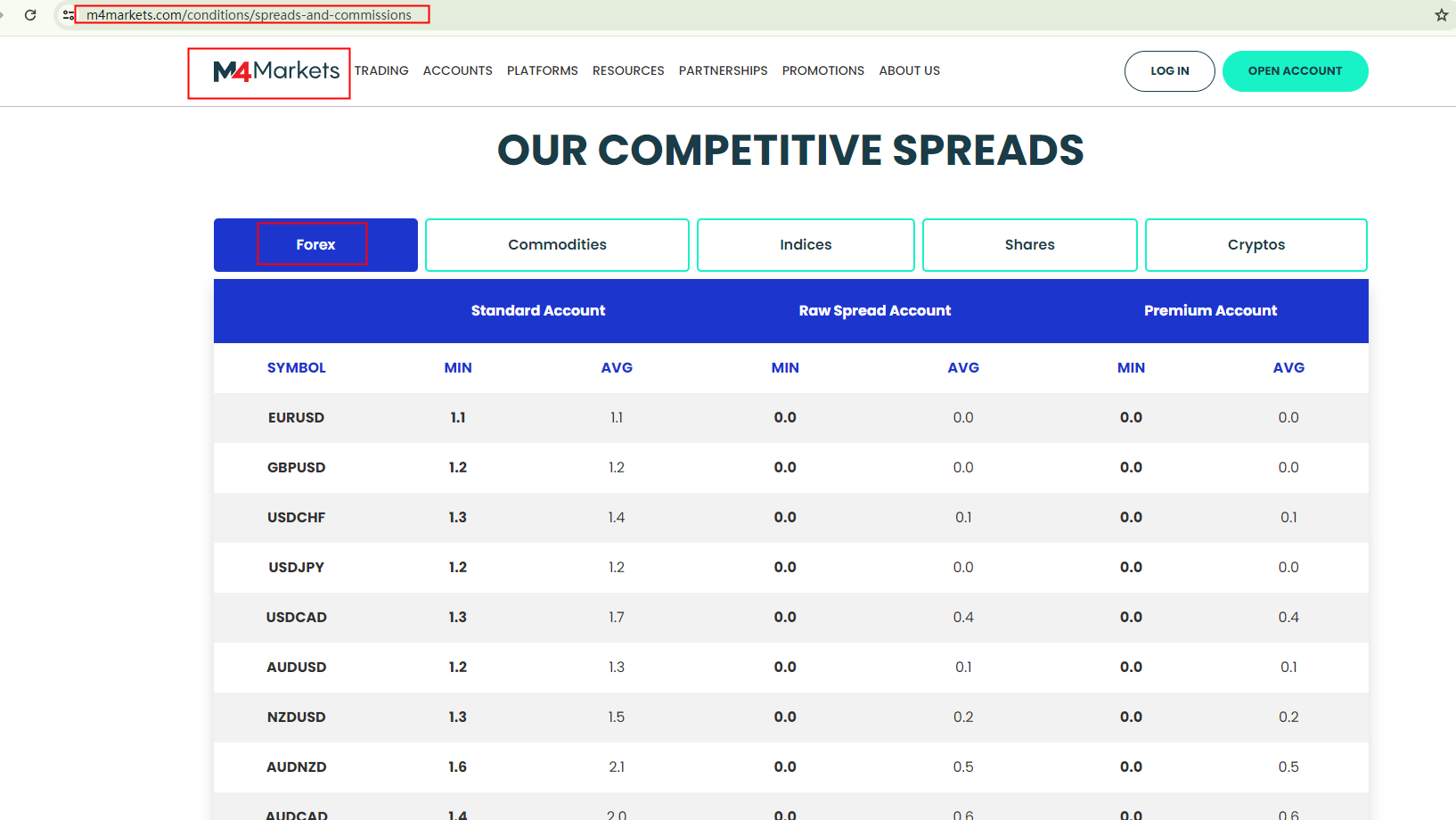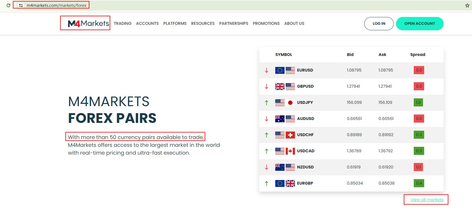 M4Markets offers more than 50 currency pairs for trading, according to their website. The full list of available currency pairs can be found in the "Spreads and Commissions" section under the "Trading" category. Alternatively, you can access the complete list by clicking on the "View all markets" link on the Forex page.