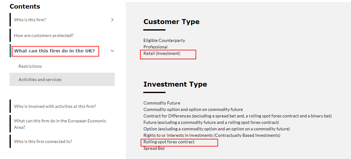 3. وستحصل على محتويات الوسيط على موقع FCA الإلكتروني. في هذا الوقت سوف تنقر على "ما الذي يمكن أن تفعله هذه الشركة في المملكة المتحدة؟" وتحقق مما إذا كان الوسيط لديه التفويض لتقديم "عقد تداول العملات الأجنبية" إلى عميل "التجزئة"؛