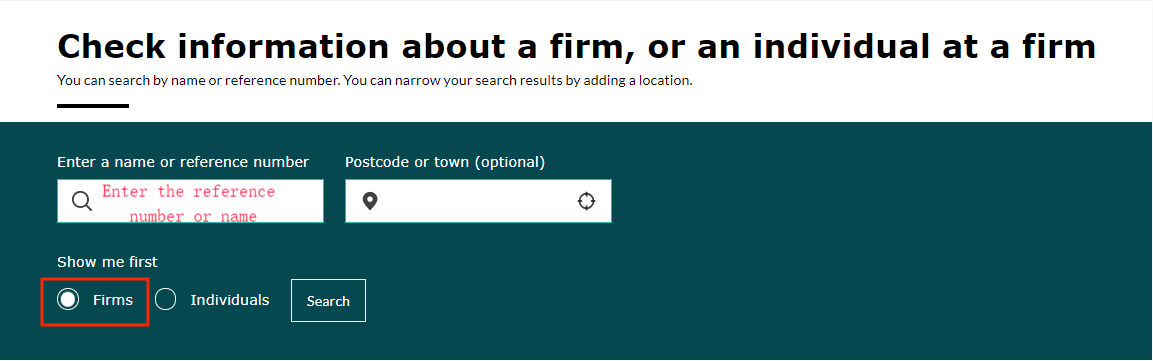 2. أدخل الرقم المرجعي. أو الاسم في شريط البحث على https://register.fca.org.uk/s/;