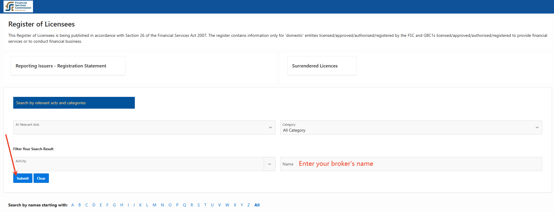 2. أدخل الاسم في شريط البحث https://opr.fscmauritius.org/ords/opr/r/fsc-opr/fsc-online-public-register-opr. سيتم عرض قائمة بالشركات التي تلبي استفساراتك. اضغط على أيقونة العين الزرقاء الموجودة بجوار اسم الشركة لعرض التفاصيل. إذا لم يكن الوسيط الخاص بك مدرجًا، فقد يتم اعتباره غير مرخص من قبل لجنة موريشيوس FSC.