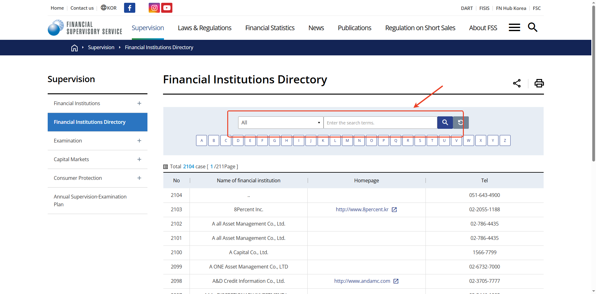 2. أدخل اسم الكيان في شريط البحث على الرابط التالي: https://www.fss.or.kr/eng/sprvise/instt/list.do?menuNo=400029&pageIndex=1&englsFncEngnName=&fnltCtgryCode=&searchStr=;
