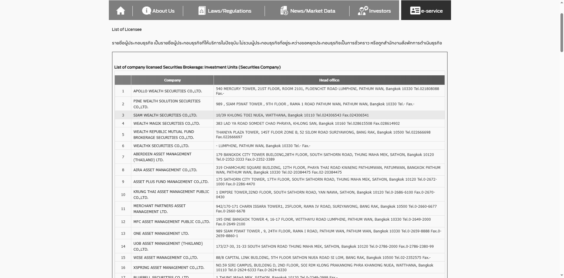 للتحقق من ترخيص شركة ما من قبل هيئة الأوراق المالية والبورصات التايلاندية، اتبع الخطوات التالية: