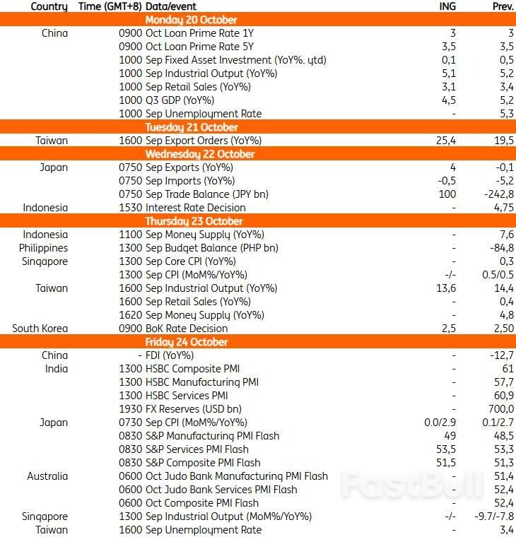 يبدأ صباح يوم الاثنين بقرار بشأن أسعار الفائدة الأساسية للقروض. لا يُتوقع أي تغيير بعد أن أبقى بنك الشعب الصيني على سعر الفائدة دون تغيير. كما ستصدر الصين يوم الاثنين بيانات الناتج المحلي الإجمالي للربع الثالث. باستثناء انتعاش أقوى من المتوقع في سبتمبر - حيث نتوقع حاليًا تباطؤًا طفيفًا في مبيعات التجزئة والإنتاج الصناعي ونمو استثمارات الأصول الثابتة - من المرجح أن تُظهر البيانات تباطؤًا ملحوظًا في الصين إلى 4.5% على أساس سنوي. كما سنحصل على بيانات أسعار العقارات لشهر سبتمبر. شهدت الأسعار انخفاضًا حادًا في الأشهر الأخيرة. وفي ظل عدم وجود تحفيز جديد، لا يوجد ما يدعو إلى توقع حدوث تحسن كبير.
