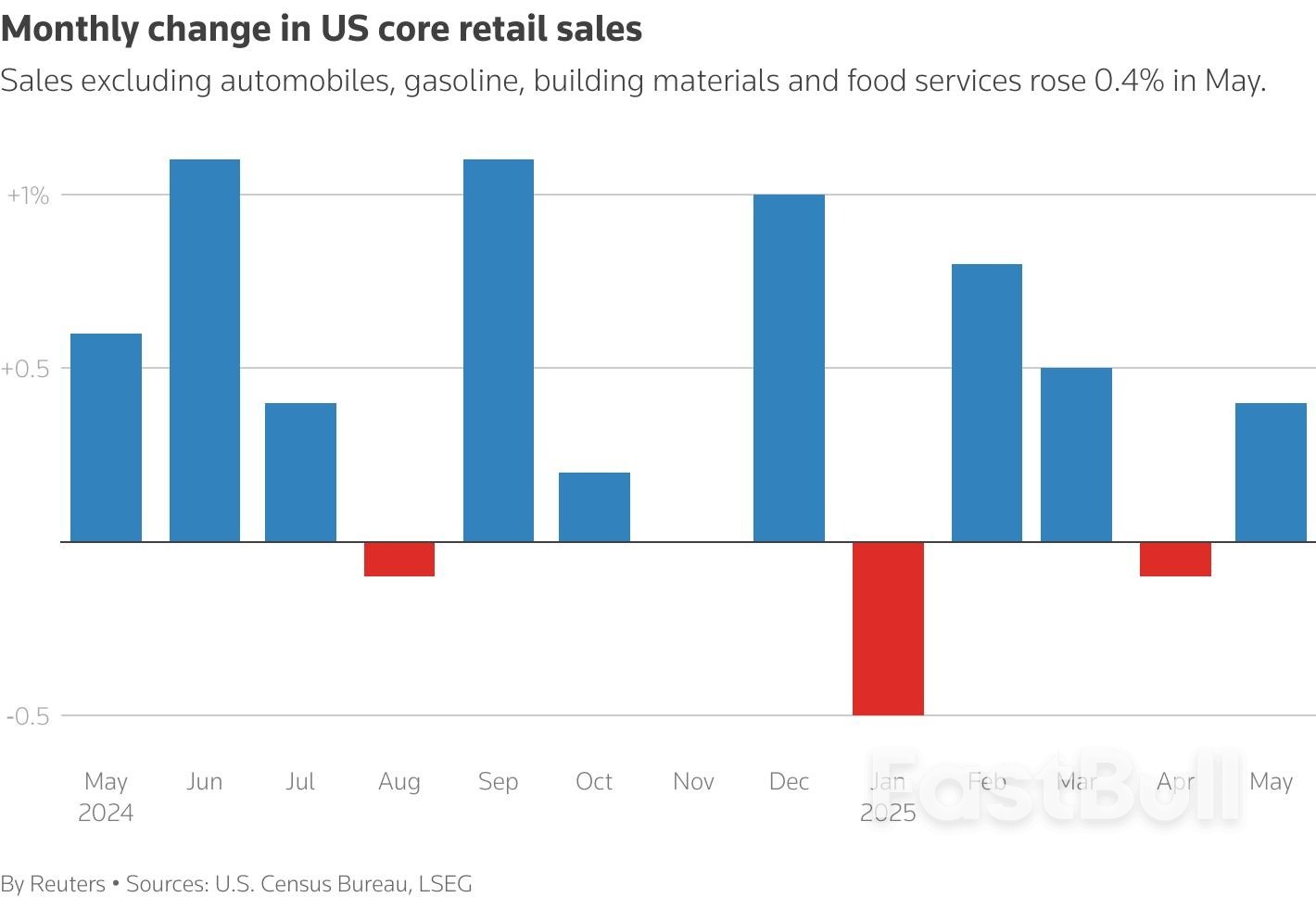 وارتفعت مبيعات التجزئة باستثناء السيارات والبنزين ومواد البناء والخدمات الغذائية بنسبة 0.4% في مايو/أيار بعد انخفاض بنسبة 0.1% في أبريل/نيسان.