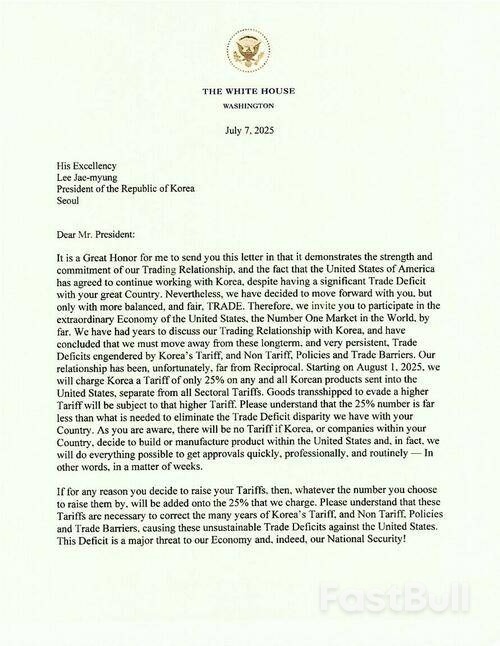 باختصار، تُعدّ هذه الرسالة إنذارًا تجاريًا نهائيًا من إدارة ترامب إلى كوريا الجنوبية واليابان ودول أخرى، للضغط عليها لخفض الحواجز التجارية والتعريفات الجمركية، وإعادة الصناعات التحويلية إلى الولايات المتحدة. تُشير الرسالة إلى أجندة أوسع نطاقًا تتبنى مبدأ "أمريكا أولًا" ودبلوماسية تعريفات جمركية، تهدف إلى خفض العجز التجاري من خلال معاقبة الدول التي تُعتبر ممارسات تجارية غير عادلة. ونتوقع إرسال الرسائل الأخرى قريبًا.