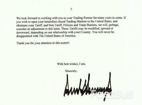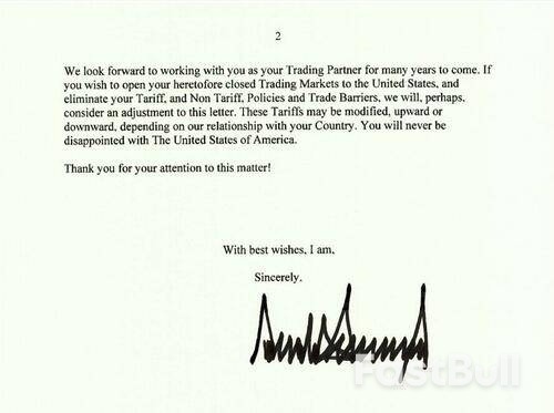 تم إرسال أول رسالتين تجاريتين إلى كوريا الجنوبية واليابان، لفرض تعريفة جمركية بنسبة 25% على جميع السلع، اعتبارًا من الأول من أغسطس.