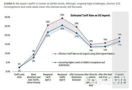 كمعيار، يعتقد اقتصاديو DB أن معدل التعريفة الجمركية الفعلي الحالي يبلغ حوالي 15% (كما هو الحال في مورغان ستانلي، انظر الرسم البياني أدناه)، وهو أقل بكثير من المعدل المفترض ليوم التحرير، ولكنه أعلى بكثير من المعدلات المنخفضة التي كانت سائدة قبل عودة ترامب إلى منصبه. ومن الأخبار السارة للأسواق أن المادة 899 (ضريبة الانتقام) قد أُدرجت في كتب التاريخ بعد عدم إدراجها في مشروع قانون الضرائب. ومن الأخبار السارة أيضًا أن بيسنت بدا مؤخرًا أكثر تفاؤلًا بشأن مسار العمل في المحادثات الأخيرة.