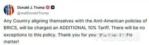ثم نشر ترامب بين عشية وضحاها على وسائل التواصل الاجتماعي أن "أي دولة تنضم إلى سياسات مجموعة البريكس المعادية لأمريكا، ستُفرض عليها رسوم جمركية إضافية بنسبة 10%".