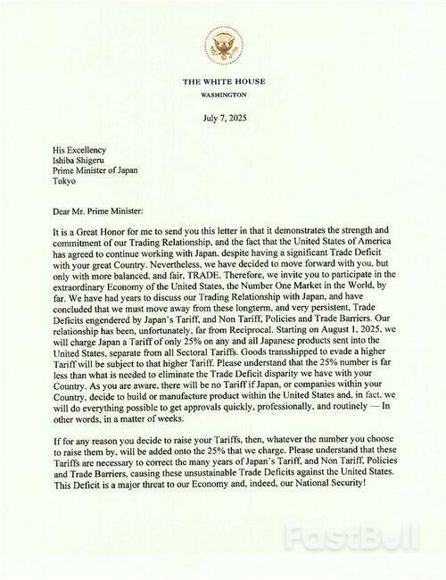 صرح الرئيس ترامب نهاية الأسبوع الماضي بأنه بحلول الموعد النهائي في 9 يوليو، ستكون الرسوم الجمركية "مغطاة بالكامل، وستتراوح قيمتها بين 60% و70%، و10% و20%". ثم قال خلال عطلة نهاية الأسبوع إنه "وقع بعض الرسائل، وستُرسل يوم الاثنين - ربما 12 رسالة". تأكد هذا الخبر ليلاً حتى ظهر اليوم بتوقيت واشنطن، لذا توقعوا سيلاً من العناوين الرئيسية عند الظهر!