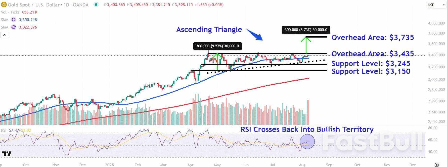يمكن للمستثمرين توقع هدف سعري صعودي أعلى من أعلى مستوى تاريخي للذهب باستخدام تقنية الحركة المقاسة، وهي أداة تُحلل أنماط الرسوم البيانية للتنبؤ بحركات الأسعار المستقبلية. عند تطبيق هذا التحليل، نحسب مسافة المثلث الصاعد بالقرب من أوسع جزء منه، ونضيف هذه القيمة إلى خط الاتجاه العلوي للنمط. على سبيل المثال، نضيف 300 دولار أمريكي إلى 3,435 دولارًا أمريكيًا، مما يُشير إلى هدف سعري يبلغ 3,735 دولارًا أمريكيًا، أي أعلى بنحو 10% من مستويات التداول الحالية للسلعة.