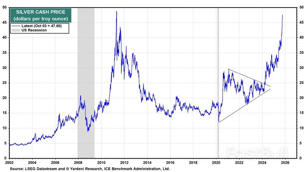 وارتفع سعر الفضة أيضًا وينبغي أن يستمر في الارتفاع جنبًا إلى جنب مع سعر الذهب، على الرغم من أن كلاهما قد يكون عرضة للتراجع أو على الأقل فترة قصيرة من التوحيد (الرسم البياني).