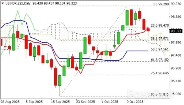 تراجع من أعلى مستوياته في عدة أسابيع (99.22/29) حيث حوصر الثيران الأكبر حجمًا من أدنى مستوى جديد لعام 2025 (95.82) عند مستوى فيبوناتشي 76.4% من الهبوط 100.04/95.82، وواجهوا رياحًا معاكسة من منطقة الدعم 98.00 (قمة سحابة إيشيموكو اليومية السميكة/فيبوناتشي 38.2% من الارتفاع 95.82/99.29).