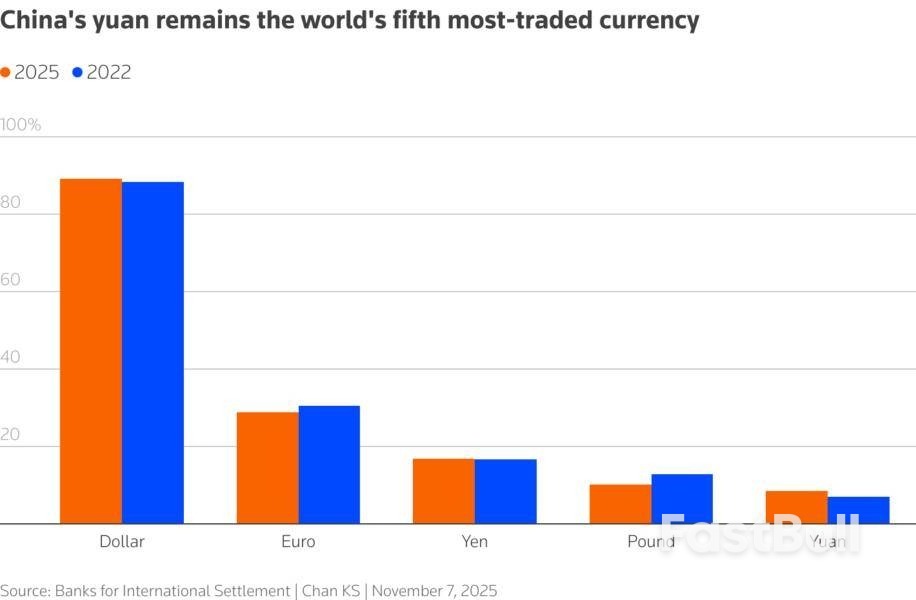 قد يكون اقتصاد الصين، الذي يبلغ حجمه 20 تريليون دولار أمريكي، ثاني أكبر اقتصاد في العالم، إلا أن عملته لم تكن سوى خامس أكثر العملات تداولًا العام الماضي، وفقًا لتقرير صادر عن بنك التسويات الدولية في سبتمبر/أيلول. ومع ذلك، وبفضل السياسات التدريجية، بما في ذلك اتفاقيات مبادلة العملات مع البنوك المركزية الأخرى، يُشكل اليوان الآن 8.5% من معاملات العملات العالمية، ارتفاعًا من 7% في عام 2022.