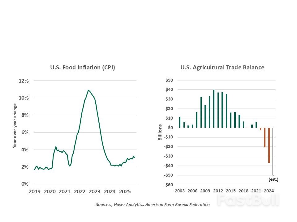 أثرت التوترات التجارية هذا العام على القطاع الزراعي بعدة طرق. لم تكن المواد الغذائية مستثناة من الرسوم الجمركية المتبادلة الشاملة التي أُعلن عنها في أبريل/نيسان، بل تبعتها رسوم إضافية على دول محددة. وقد أدى ذلك إلى ارتفاع تكلفة الشحنات الواردة، وبالتالي أسعارها للمستهلكين الأمريكيين. وتشير تقديرات مؤسسة الضرائب إلى أن ما يقرب من ثلاثة أرباع واردات المواد الغذائية الأمريكية تخضع لضرائب استيراد أعلى مما كانت عليه في بداية عام 2025.